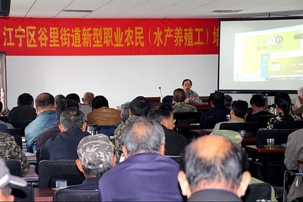 培训会上,刘教授首先为大家分析了江苏地区水产养殖现状及本地区各类水产养殖区域的划分,指出江苏淡水养殖具有资源充足、养殖经验丰富、产业一体化等一系列优势;刘教授建议大家尝试养殖“文化鱼”(即用于观赏、垂钓的鱼类),该养殖产业前景颇佳。同时,刘教授就三类最常见养殖的鱼种,具体介绍了其养殖模式、养殖技术、资金投入及未来收益,分析了其产量下降的相关原因。
