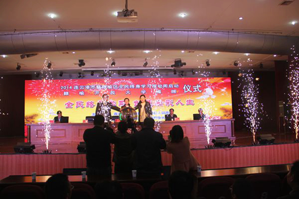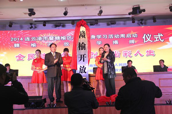 活动仪式上,连云港开放大学党委书记、校长林振江、区政府副区长宫平共同为“赣榆开放大学”揭牌,连云港市教育局副局长高健、连云港开放大学校长林振江、赣榆区政府副区长宫平共同按下了象征着“2014年连云港市暨赣榆区全民终身学习活动周启动”的启动球。