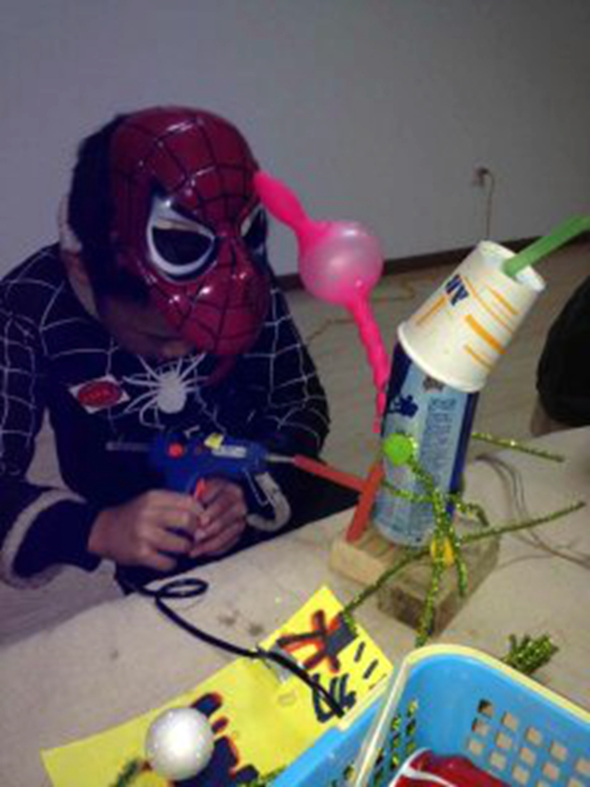 活动以闯关的形式展开,完成规定的任务即为闯关成功。第一关蜘蛛侠来袭,要求孩子为父母“画”妆成蜘蛛侠,父母为孩子穿上神圣的战袍,即可进入第二关——我是环保小卫士。美育堂教师陶红和美育志愿者带领市民朋友骑自行车到鹤山镇猪市河坝街参观“废旧物品回收站”,亲眼目睹身边惊人的浪费现象,让参与者意识到节约已经到了刻不容缓的地步。然后在废旧物品回收站购买3个废弃易拉罐,再骑车返回出发地进入第三关——我爱清洁。参与者到后花园清洗购买的废弃物并擦干,待进入下一关使用。第四关——我会变废为美。参与者进入创意空间,用自己手中的废旧拉罐创造独特的作品——超级机器人,制作过程中可以借助各种辅助材料和工具,材料用多少取多少,随时随地厉行节约。经过参与者的精心制作,一件件充满奇思异想的作品呈现出来。作品完成后进入第五关——我会节约食物。来到自助餐厅,享受美食。取食物时要求每个家庭只领取一个盘子,自选需要的食物;宝贝要先请家长吃,自己再吃,孝心教育从细节入手;晚餐结束时盘中无剩物,节约从点滴做起。