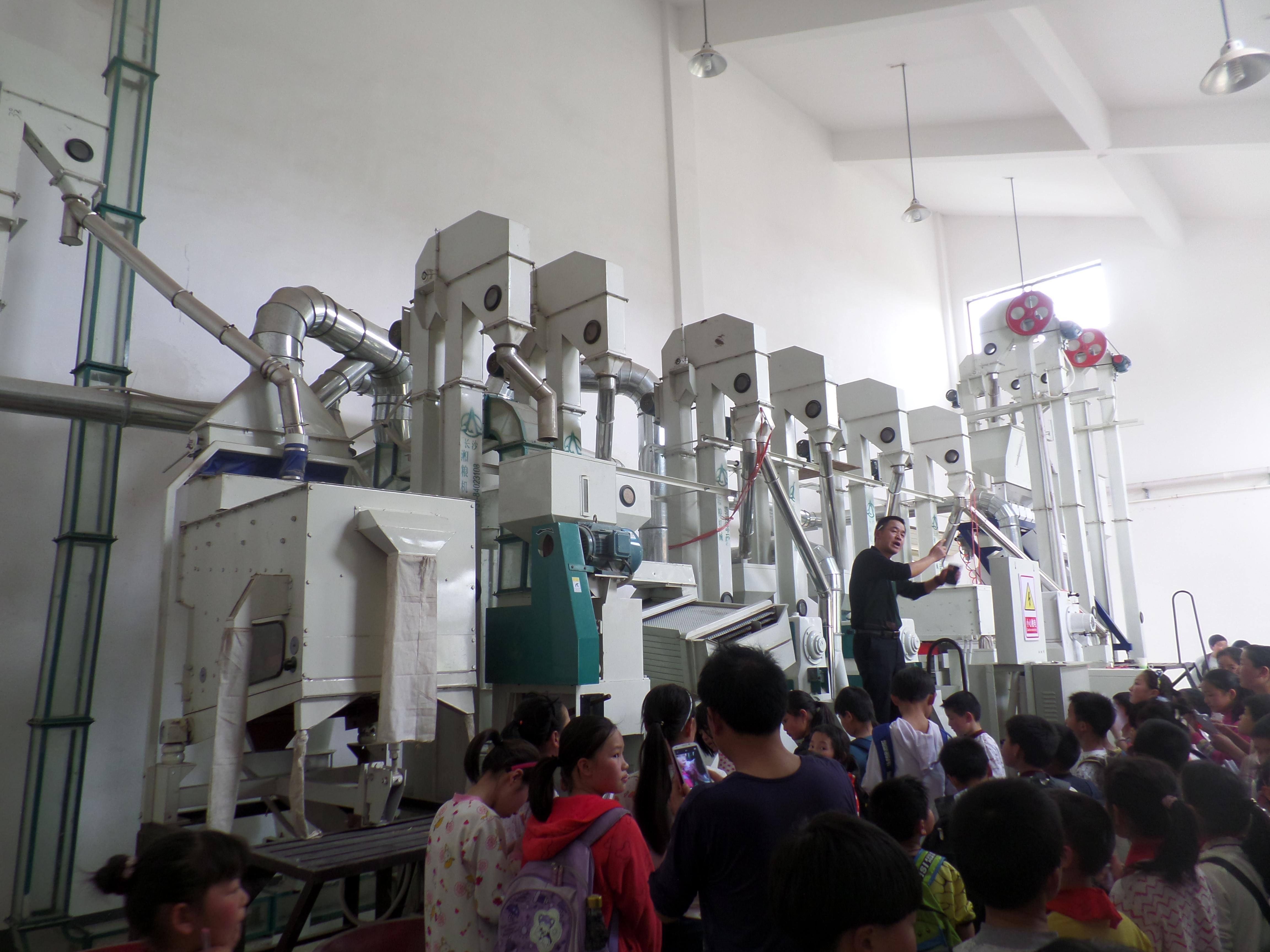 学生认真听校长讲解“智能粮食加工机器”的运作,兴趣浓厚。