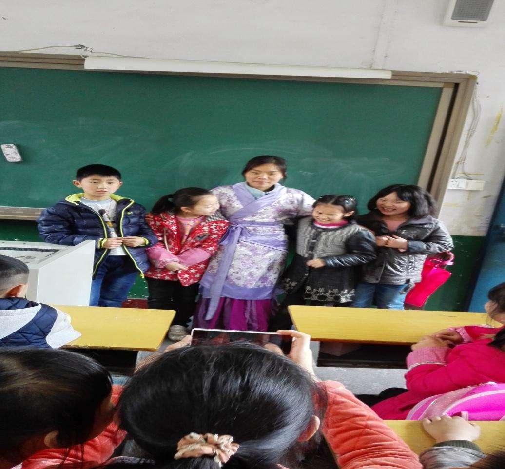 首先是服饰文化展示,志愿者简单介绍了汉服的种类、样式及文化含义,然后四年级班主任李老师主动充当服装“模特”,换上各式各样的华丽汉服,并摆出各种造型,引得同学生欢呼声一片,纷纷跑上台和老师合影。