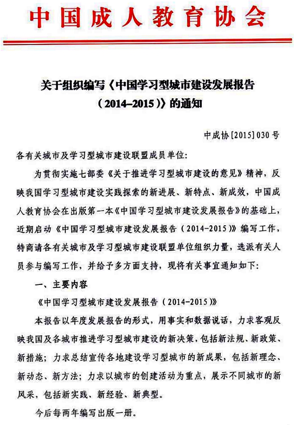 中成协:关于组织编写《中国学习型城市建设发展报告(2014-2015)》的通知
