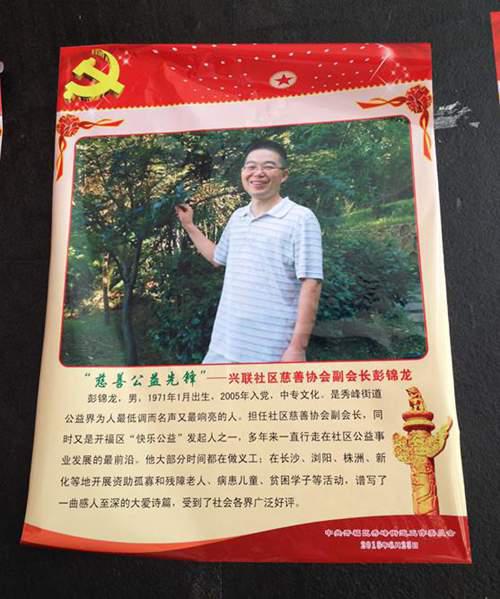 彭锦龙,是该街道兴联社区从事建筑和外贸生意的农民企业家。前些年,他和爱心人士成立了开福区“快乐公益”组织,多次深入株洲、浏阳、新化、新晃等山区,开展资助孤寡老人、孤儿、病患儿童、贫困学子等爱心活动。截至目前,他和团队捐助百余人,爱心款达一百多万元。可他为人一直很低调,从不像别人张扬。看了专题片后,很多群众竖起了大拇指:“这样的人绝对是我们的偶像。”