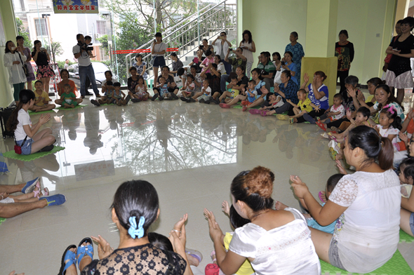 此次研讨会分为两个阶段,第一阶段是蒲江县早教中心(北街幼儿园)的社区教育志愿者在长秋新村早教室为与会者提供了现场观摩活动。90分钟的活动通过0-3岁婴幼儿及带养人60余人的早操、游戏、亲子互动,展示了社区教育依托0-3早教资源为社区新市民传授科学的育儿观念、带养方法。现场气氛和谐,其乐融融,深受观摩者好评。