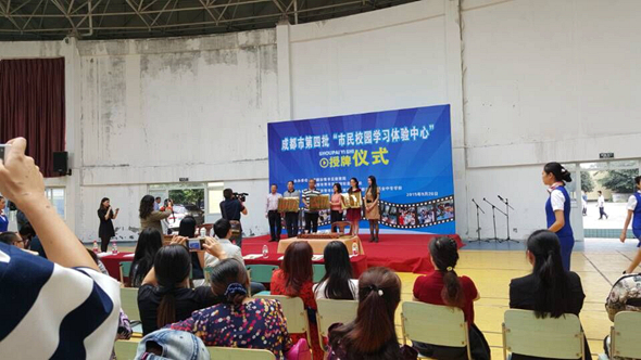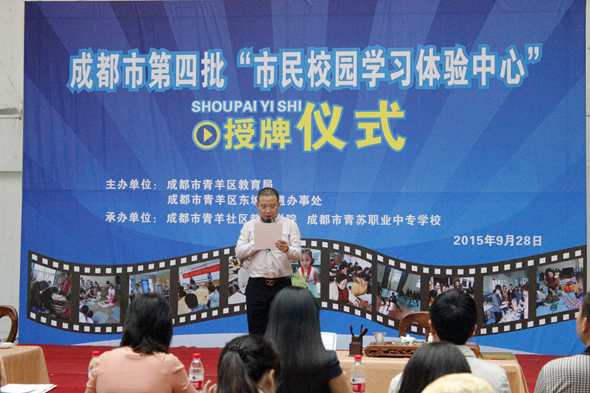 2015年9月28日下午,在成都市青苏职业中学体育馆,举行了第四批“市民校园学习体验中心”授牌仪式。区教育局、东坡街道、青羊社区教育学院相关领导,区内各市民校园学习体验中心负责人,东坡街道社区居民代表,青苏职中市民校园学习体验中心学员及学生代表,区社区教育学院相关人员参加了此次授牌仪式。