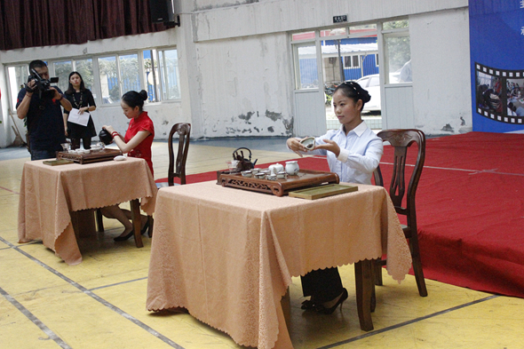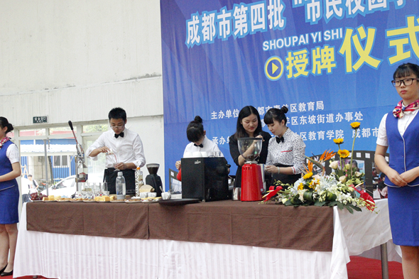 活动现场,区教育局和区社区教育学院相关领导为青苏职中、彩虹小学、石室联中西区三个学校授牌,双眼井小学市民校园学习体验中心学员快板展示,青苏职中带来的咖啡、茶艺、插花等整合课程体验项目供当天参与活动的市民体验学习。