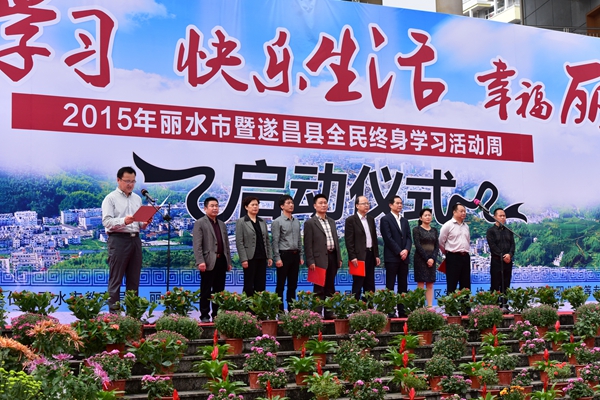 11月6日,以“快乐学习、快乐生活、幸福丽水”为主题的2015年丽水市暨遂昌县全民终身学习活动周启动仪式在遂昌职业中专隆重举行。浙江省社区教育指导中心副主任眭宝良,丽水市委宣传部常务副部长任韩高,丽水社区大学校长刘建荣,丽水市教育局副局长吴燕,丽水社区大学副校长陈继理,遂昌县委常委、宣传部长华治武,遂昌县人民政府副县长鲁子钗等出席活动,遂昌县教育局局长雷伟东主持启动仪式。