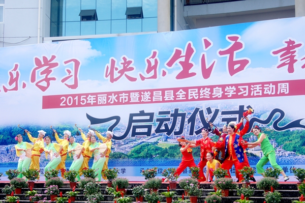 遂昌职业中专以及遂昌城中社区、城北社区、城南社区、城东社区、石练社区的表演者表演了舞龙、茶艺、昆曲十番、舞蹈、葫芦丝演奏等精彩的文艺节目,将现场气氛推向高潮。启动仪式结束,与会者参观了全市社区教育成果展。