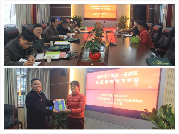 交流中, 王信芳书记首先向考察团一行介绍了玄武区社区教育基本情况,并针对来宾所问作了玄武区社区教育发展介绍,介绍了我区社区教育理念创新、项目推进、课程建设、课题引领、队伍建设、品牌打造等,着重介绍了近年玄武区着力建设生态式学习型社区的新举措以及所取得的丰硕成果。王书记还向南京化工园区赠送多本我区自编社区教育读本等材料。