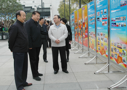 安徽省教育厅副厅长谢平在市教育局副局长唐文水的陪同下观看各县区终身教育活动展板