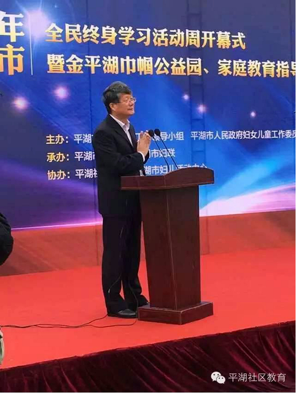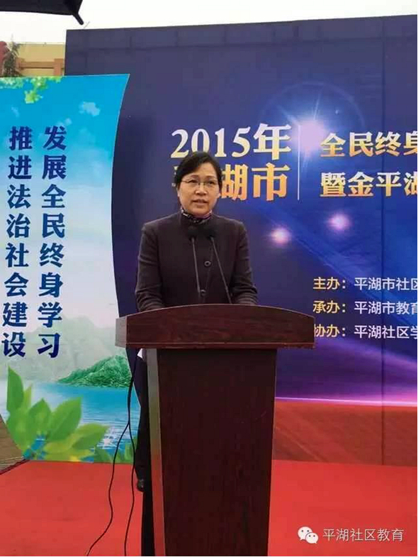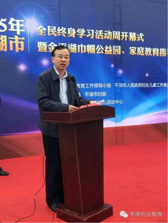 浙江省妇联副主席童丽君,省妇联组织联络部部长鲍冬芳,平湖市委副书记潘川弟,平湖市政府副市长顾玉峰,嘉兴市妇联副主席冯丹,嘉兴市教育局职成教处长丁海根,平湖市委办副主任潘加林,平湖市教育局局长韩云付,平湖市民政局局长谢龙华,平湖市妇联主席严周萍等领导出席了开幕式。活动主题是:“发展全民终身学习 推进法治社会建设”、“凝聚公益力量 服务妇女儿童”。来自平湖市社区教育工作领导小组各成员单位、平湖社区学院、各乡镇(街道)社区教育中心及工作站、各乡镇(街道)妇委会、2015年市级百姓学习之星、学习型家庭等300余名代表参加了活动。开幕式由平湖市政府副市长顾玉峰主持。