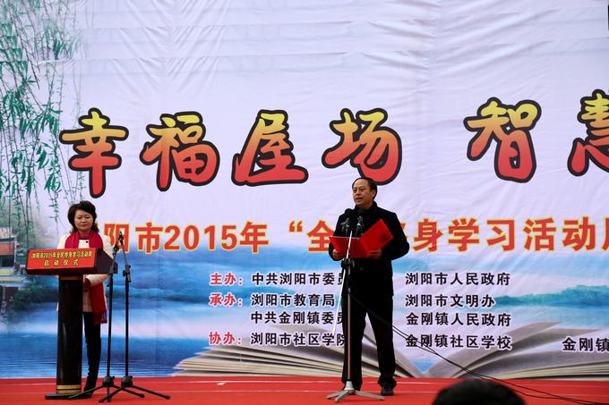 11月26日上午,浏阳市2015年全民终身学习活动周启动仪式在该市金刚镇金市社区何家大屋隆重举行,共300余人参加。开幕式由中共浏阳市委员会、浏阳市人民政府主办,浏阳市教育局、浏阳市文明办、中共金刚镇委员会、金刚镇人民政府承办,浏阳市社区学院、金刚镇社区学校、金市社区协办,由浏阳市人民政府副市长邓雪琴主持。
