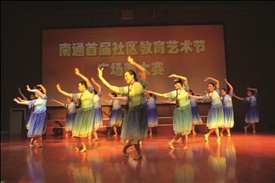 挖掘社会人才,组建各类文艺队伍。学校根据居民特长,有选择地在各社区成立文艺队伍,如戏曲、舞蹈、合唱、朗诵等,并选派社区教育师资库中的骨干教师定期辅导。2015年6月,在市委宣传部、老干部局,市教育局、市文广新局等六个部门的大力支持下,南通开放大学举办南通首届社区教育艺术节,为期半年的艺术节里,开展了广场舞、大合唱、朗诵等比赛,来自崇川、港闸、开发区各街道社区的共五十多支文艺队伍、近五千人报名参加,参赛选手年龄最大的85岁,年龄最小的10岁,祖孙同台,老少同乐,居民们用欢快的舞蹈和歌声演绎了自己的精彩人生。