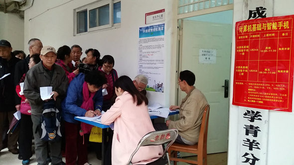 3月8日一大早,尽管春雨绵绵,但仍然阻挡不了青羊市民学习的热情! 今天是学院内居民免费公益课程招生报名的第一天,青羊社区教育学院内到处可见社区教育工作人员们忙碌的身影。2月下旬大家就在青羊区各街道、各社区、各院落的门口张贴出了2016年青羊区春季免费公益课程招生海报,社区居民闻讯纷纷前来报名,居民积极性相当高,报名场面十分火爆。截止上午10点,大部份班次的学位已被热情的市民们抢报一空,可谓一位难求。
