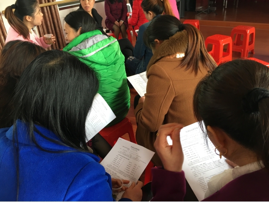 下课间隙时间,学员们拿着老师发的简谱互相讨论