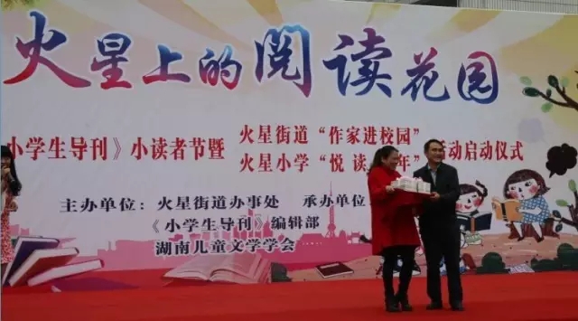 火星小学校长常旌女士向全校师生宣读了“悦读少年”活动倡议书,希望同学们爱阅读、会阅读。这次小读者节上,火星小学的小朋友迎来了几位特别的大朋友——芙蓉区人民政府张庆和副区长兴致勃勃地观看了孩子们的节目;湖南教育报刊社副社长兼副总编辑龚鹏飞介绍了《小学生导刊》设立“小读者节”,就是要广大小朋友爱上阅读,养成良好阅读习惯;芙蓉区教育局谢小红局长热情致词,充分肯定书香校园建设;火星街道办事处的叔叔们为孩子们准备了一份特别的礼物——“红辣椒”原创儿童文学图书。赠书仪式上,火星小学常旌校长从火星街道党工委书记刘长学手中接过图书,同学们欢呼着报以热烈的掌声。