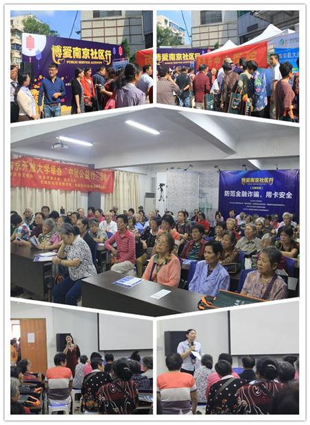 “博爱南京社区行”是南京市文明办和南京日报连续开展八年的公益活动,并获得中央文明办的肯定和支持,称此活动是“把纪念传统节日与现代公益行动相结合的生动范例”,现已经成为我市的一项文明品牌活动。此次送教进社区的“中秋公益行”活动,是由玄武区暨南京开放大学共同精心设计的,其活动内容一是整合医疗服务进入梅园新村街道北安门社区行,为玄武区社区老年居民进行免费体检,并宣传老年大学相关课程,将教育平台在有效人群中针对性的进行宣传推广,为老年人送去健康和知识的问候,同时为“南京学习在线”、“博学玄武学习在线”打造良好的社会形象。二是特邀“浦发银行”南京城西支行经理邓艳开展《金融诈骗的防范》专题讲座,邓经理从点滴金融知识讲起,引导社会公众提高维护自身资金和信息安全的意识和能力。讲座中,除宣讲资金安全常见漏洞、维护技巧等内容外,还为大家讲解了日常生活中常见的诈骗案例,通过这些发人深省的案例,告诉大家如何识别诈骗手段,防止被骗。居民们通过聆听讲座,了解现在金融市场普遍风险和如何规避风险并根据自己的情况考虑适合自己的理财方式。同时,还手把手教大家正确识别假币,现场解答客户疑问,现场气氛活跃。讲座结束后,居民纷纷表示,希望以后多开展此类活动,让自己能掌握更多的防范金融诈骗知识。参加送教进社区“中秋公益行”活动的居民,还通过扫二维码参与“南京学习在线”、“博学玄武学习在线”的有关在线学习活动。