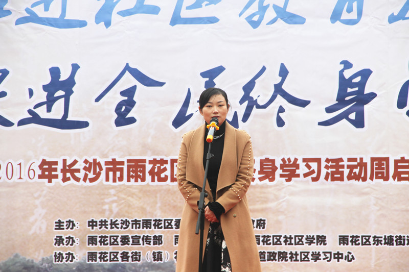 活动的第一个议程是东塘街道办事处主任黄金致辞,她热诚欢迎大家来到长沙市核心商业圈东塘街道参加此次盛举。接着是长沙市雨花区人民政府副区长(提名人选)易静讲话。易静副区长指出社区教育是一项十分重要的工作,我们应该要认真思索五个问题,一是我们为什么要开展社区教育,二是社区教育要教什么,三是要怎样开展社区教育。四是谁来开展社区教育,五是以什么样的形式开展社区教育。易静副区长提醒我们社区教育工作者时刻牢记两点,社区教育一定要群众喜爱和群众受益,只有本着这个原则去开展工作,我们的雨花区才能营造“人人学习、时时学习、处处学习”的良好社会环境。接着长沙教育局高教处处长丁郭宣布2016年雨花区全民终身学习活动周正式启动。