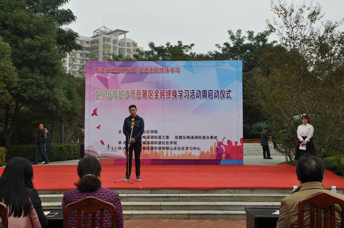 2016年11月3日上午,岳麓区2016年“全民终身学习活动周”启动式,在梅溪湖街道阳明山庄社区隆重举行。市社区大学常务副校长常立新、副校长林涛,市教育局高教处处长丁郭,岳麓区委党校常务副校长、社区学院院长邓晖,以及各街镇分管社区教育的领导、社区教育专干、志愿者代表、居民代表,参加了本次启动仪式。